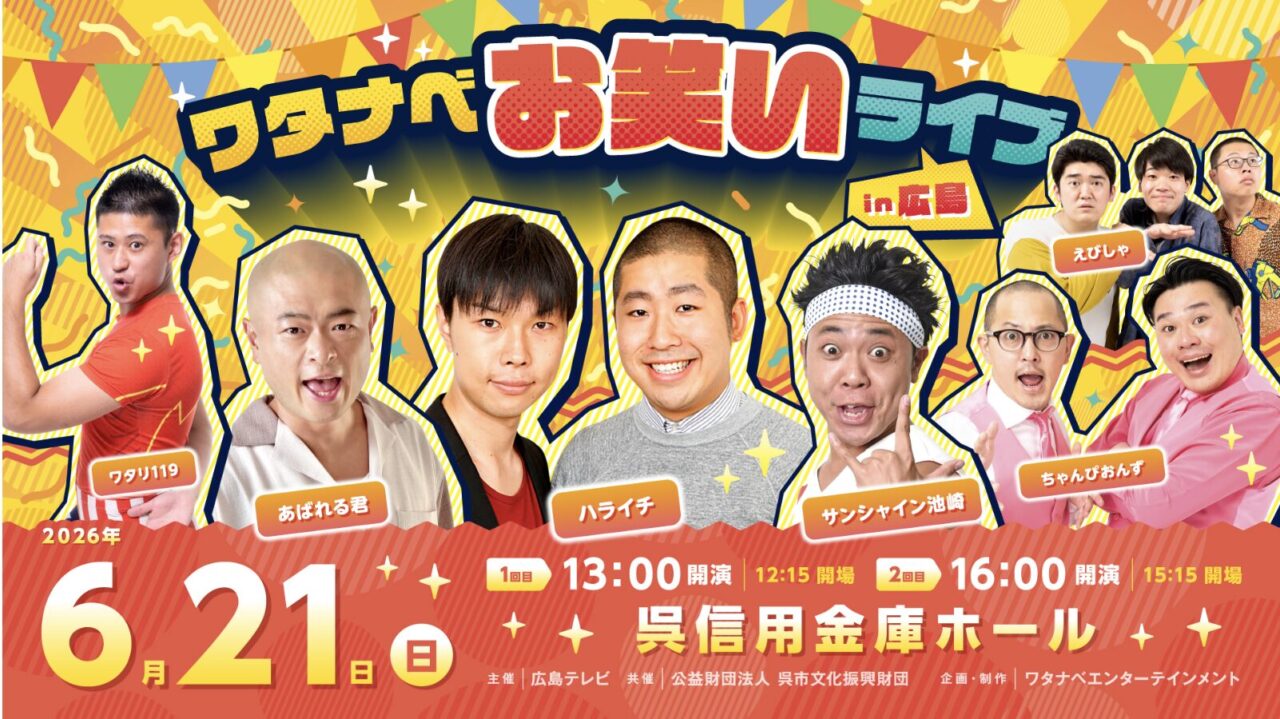 「ハライチら人気芸人が集結!『ワタナベお笑いライブin広島』6月に呉市で開催。明日20日からチケット一般販売開始」