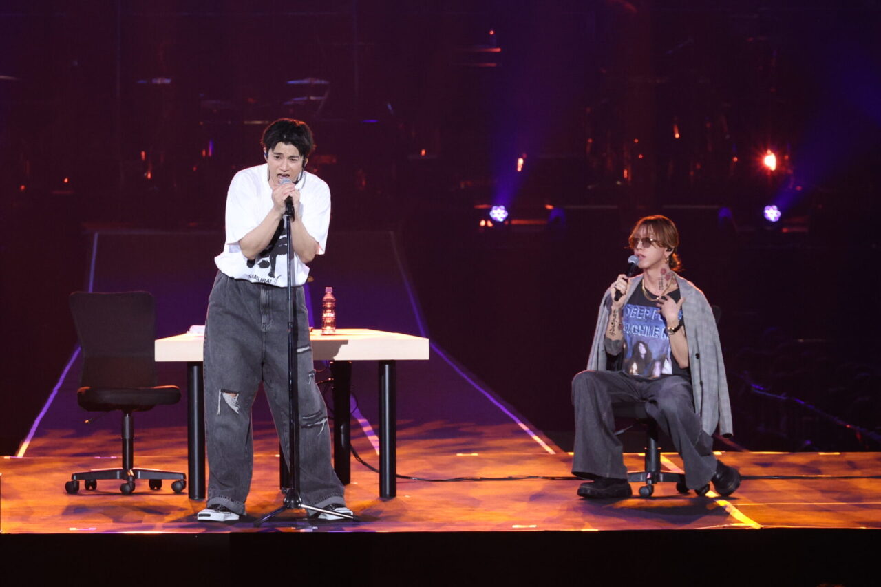 続いてライブを展開したのは、イベントに先駆けて今月6日の放送にゲスト出演したスキマスイッチが満を持して登場。横浜アリーナには何度も立ったことがある2人だが、こういったジャンルがクロスオーバーしたイベントにはなかなか出演経験がないようで「横浜アリーナで番組イベントってすごいな!」「モニターで見ていましたが、Kep1erが踊っていたステージに僕らが出るのかと(笑)」と緊張を募らせていたことを明かす。