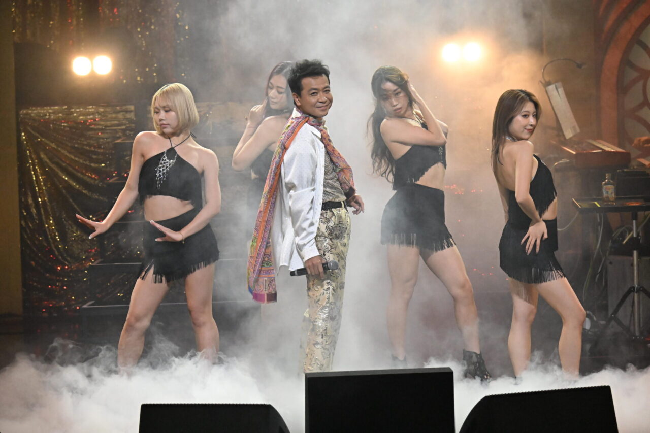 次に登場したのはこちらもデビュー30周年を迎えたMAXが登場!「Ride on time」などのヒットメドレー4曲を披露し、会場をMAX色に染め上げた。中山もステージ上に登場し「ヒッパレ的メドレー」と題し、APT.、シーズン・イン・ザ・サン、ダンシング・ヒーローなど往年のヒット曲10曲を5人で歌い上げた。最後に登場したのは芸歴50周年・水谷千重子。火サスのBGMで舞台中央階段から登場し歓声に包まれる。黄色い着物に身を包み「天使のウインク」「都会の天使たち」「愛のバラード」をしっとりと歌い上げた。ラストには、30年前に主演した名作ドラマ『静かなるドン』の新鮮組 3代目総長・近藤静也のトレードマークである白スーツにサングラスに身を包み舞台後方から中山が登場。終わりにふさわしい名曲「祭りのあと(桑田佳祐)」を披露した。