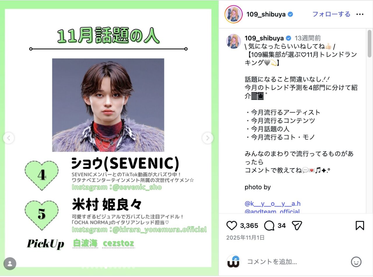 Z世代のトレンド発信地である「SHIBUYA109」のトレンドランキングにメンバーのショウが選出されるなど、感度の高い層からの支持を裏付けた。