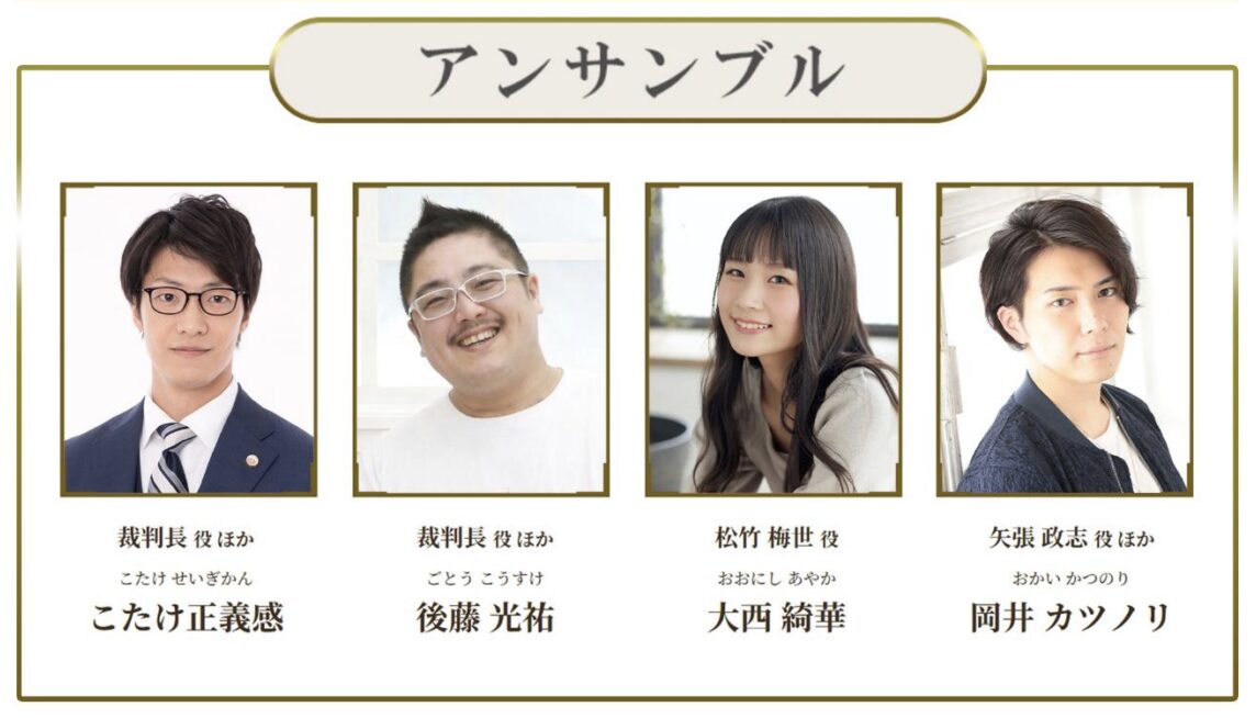 また、先日追加発表されたアンサンブルには、「逆転裁判」実況でも名高い、現役弁護士芸人のこたけ正義感をはじめ、大西綺華氏、岡井カツノリ氏、後藤光祐氏(※五十音順)の実力派揃いの総勢 20 名が出演します。
